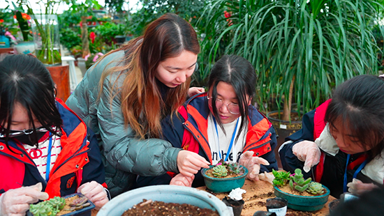 講解員系統詳盡地向大家介紹了多肉植物的小知識,引導大家認識并了解多肉植物的種類、生活習性、養護方法等,同學們聽得津津有味,還興趣盎然地向講解員提出自己的問題。講解員帶著大家種植了屬于自己的多肉植物盆栽,讓同學們體驗到了勞動的樂趣。