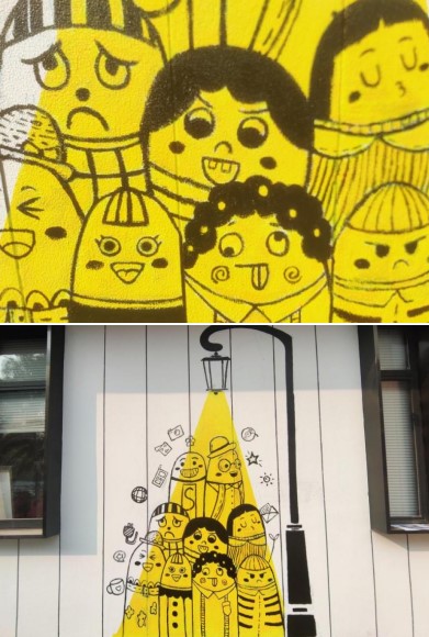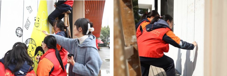 本次墻繪活動主要內容是在OTO創業體驗中心的白色外墻上進行繪制,為其增添色彩。接到任務后,同學們立馬著手準備畫稿,查閱資料,根據要求策劃繪畫方案。同學們快速換好工作服,拿出準備好的繪畫工具。大家分工明確,有的負責配色調色,有的負責描邊勾線,有的負責繪圖上色。繪畫過程中,同學們力求將每一處的顏料調出最真實的顏色,細心地勾勒出每一根線條,不放過任何一個細節??粗瓿傻膲L作品,同學們的自豪感油然而生。