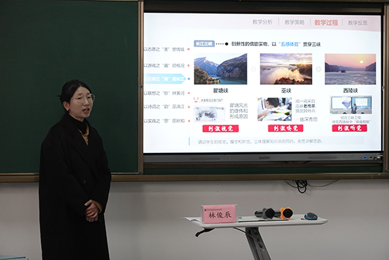 永嘉縣第二職業學校的林俊辰老師帶老師們進入《最美中國,志愿宣講》的五感體驗之旅:“觀”長江、“聞”黃河、“聽”漓江。林老師以培育學生美育素養為切入口,滋養學生思政素養。