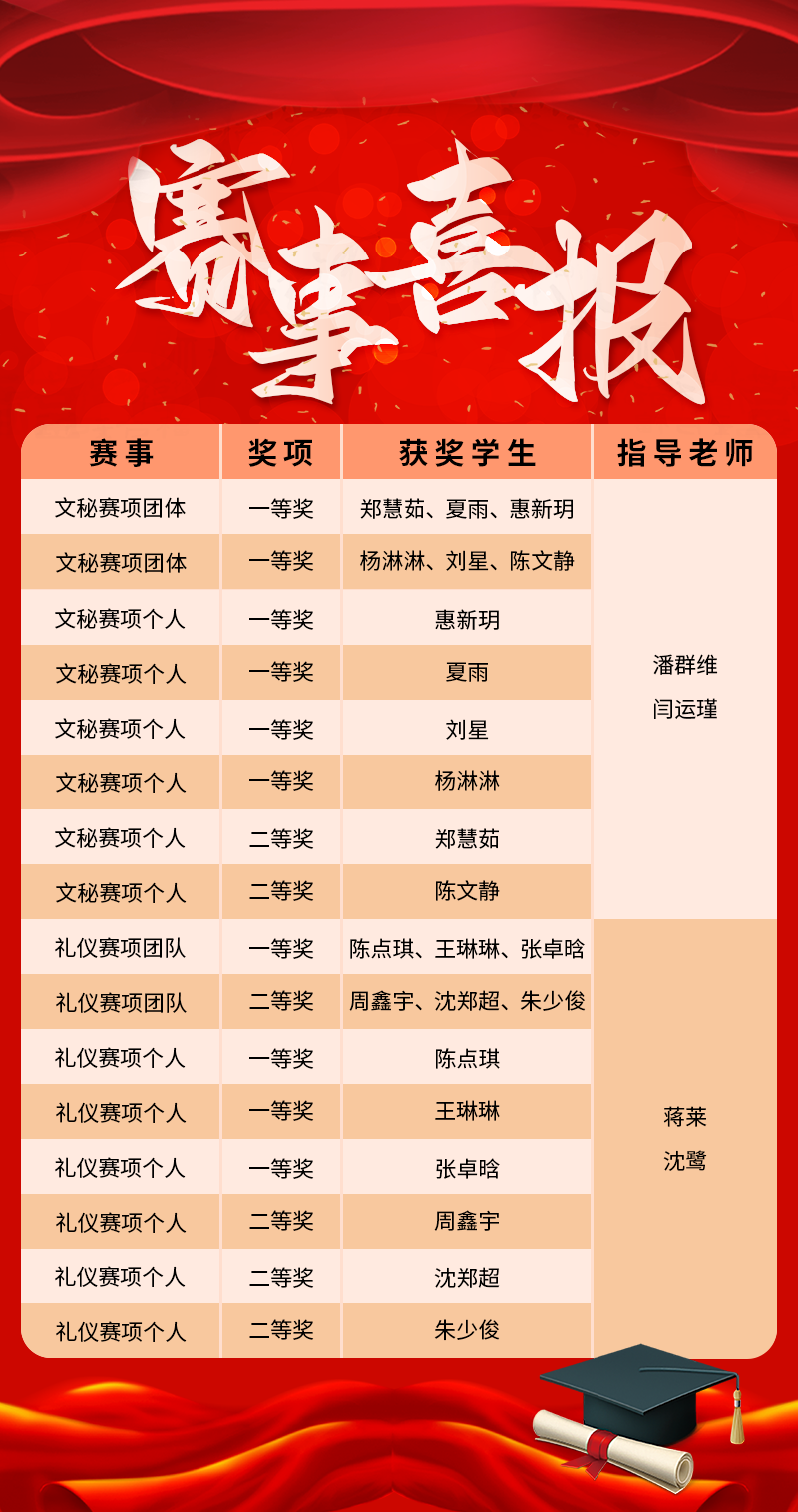 近日,成績揭曉,臨平商貿(mào)職業(yè)高級中學商務助理、會展服務與管理實現(xiàn)專業(yè)聯(lián)動,合力參賽,出征文秘和禮儀兩個賽項,共計奪得10金6銀!商務助理專業(yè)潘群維、閆運瑾老師,會展服務與管理專業(yè)蔣萊、沈鷺老師獲優(yōu)秀指導教師稱號。