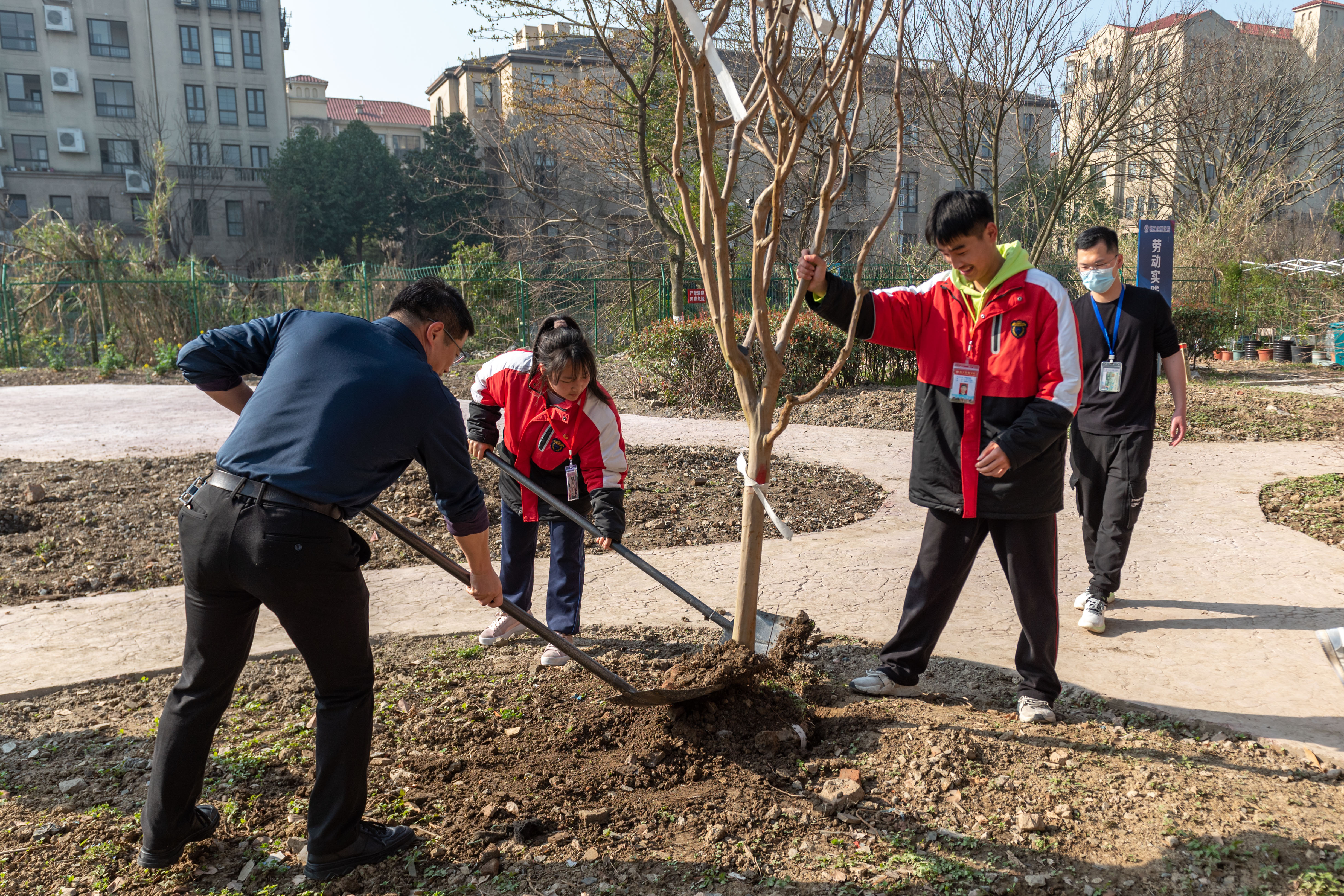 揮鍬挖土、提桶抬水、填坑埋樹、灌水扶苗……大家分工協(xié)作、配合默契,在歡聲笑語中,完成了樹苗的栽種。院團委書記洪靜老師、學生工作處負責人張文老師、烹飪旅游系主任程鋒老師,共同為“海寧黑水一家親,東西攜手傳真情”友誼林標識牌立牌培土。