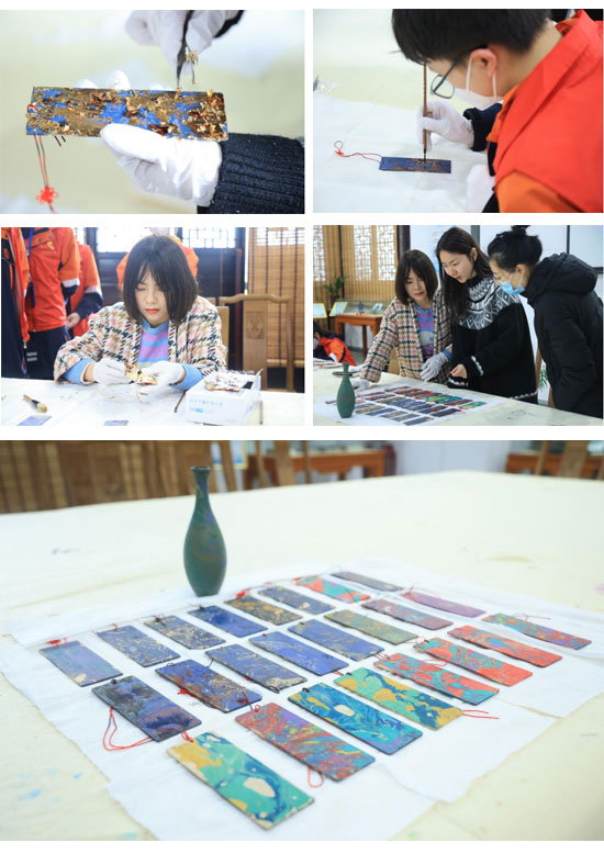 最后,每組派出代表,向老師學(xué)習(xí)描金工藝。學(xué)生們先用勾邊筆根據(jù)書簽的紋路勾上透明膠,然后再貼上金箔紙,用鑷子摳出細節(jié),最后用毛刷刷去多余的金箔,為書簽增添了一抹美麗的色彩。