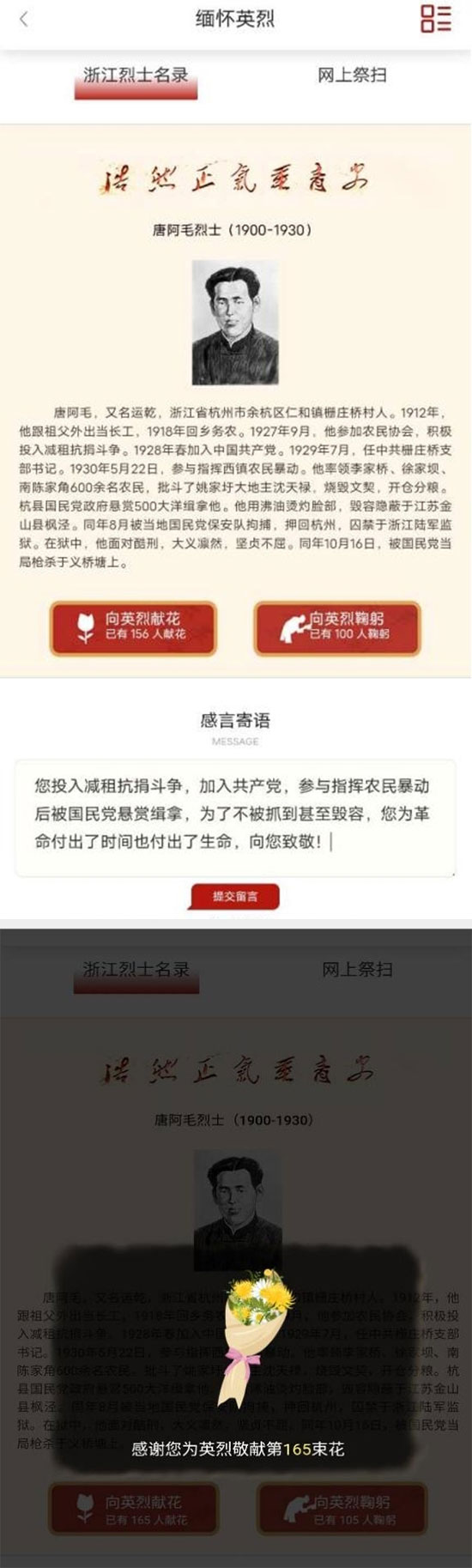 同學(xué)們?cè)?ldquo;浙江英烈網(wǎng)”開(kāi)展網(wǎng)上祭掃活動(dòng),閱讀著英烈們的生平事跡,感受著先烈舍身報(bào)國(guó)的愛(ài)國(guó)意志和敢為人先的大無(wú)畏精神,獻(xiàn)花鞠躬、寫(xiě)下寄語(yǔ),讓思念接力,讓責(zé)任延續(xù)。