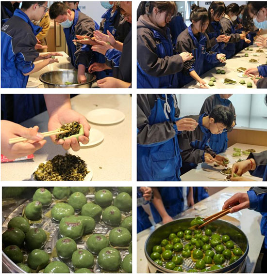 參觀結(jié)束后,大家紛紛投身到青團(tuán)制作中。青團(tuán)是清明最有特色的節(jié)令食品之一,同學(xué)們從揉面粉、將面團(tuán)均勻等分,最后將調(diào)好的餡兒包裹進(jìn)青團(tuán)內(nèi),墊上粽葉、放入蒸鍋。剛剛出鍋的青團(tuán),色澤瑩潤(rùn)誘人,油綠如玉,锃亮一新。青綠的外表,映襯著生機(jī)勃勃的春季。