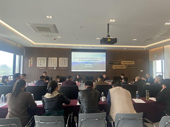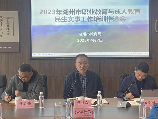4月7日,湖州市2023年職業(yè)教育與成人教育民生實事工作推進會在妙西鎮(zhèn)召開。會上總結(jié)回顧了一季度工作中遇到的困難與問題,并針對下一步重點工作展開研究部署。市教育局副局長黃桂眾、各區(qū)縣教育局、湖州社區(qū)大學、市職成教研究中心及市屬中職學校負責人參加會議。