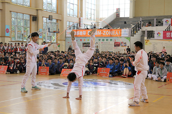 賽前,“世界冠軍進校園活動”請來了世界跳繩冠軍段中飛及其團隊,他們表演的花樣跳繩令人目不暇接,引發同學們陣陣驚嘆。