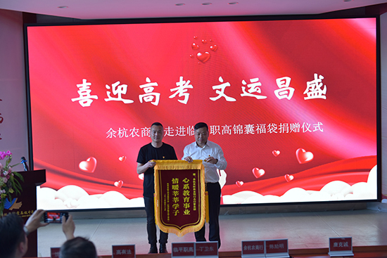 丁校長(zhǎng)代表學(xué)校對(duì)余杭農(nóng)商行的善舉表示感謝,并贈(zèng)送了“心系教育事業(yè),情暖莘莘學(xué)子”錦旗。丁校長(zhǎng)還向與會(huì)領(lǐng)導(dǎo)介紹了學(xué)校近年來(lái)高職考的成績(jī),并表示臨平職高定會(huì)鉚足干勁,奮力前行,培育更多優(yōu)秀學(xué)子,為臨平區(qū)經(jīng)濟(jì)發(fā)展貢獻(xiàn)力量。作為類型教育且與普通教育同等重要的職業(yè)教育,一定會(huì)像習(xí)近平總書記講的那樣“前途廣闊,大有作為”。
