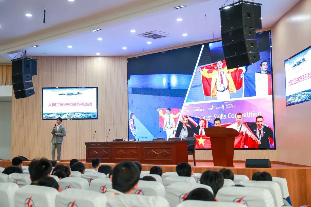 蔣應成從技能成才夢想談到個人成長歷程,他所展示的自制噴漆作品,新穎獨特、富有美感的藝術車身讓在場學生驚嘆不已。他說:“我并非美術專業出身,家境也不好,但我從小懷揣著汽車夢”,為了實現夢想,他在杭州技師學院勤奮學習,積極參加各種比賽。最終,憑借努力從云南小山村走出來,并斬獲了第44屆技能大賽汽車噴漆項目冠軍。他將自己的成功經驗凝練成10個字:堅持——奮斗——再堅持——再奮斗。