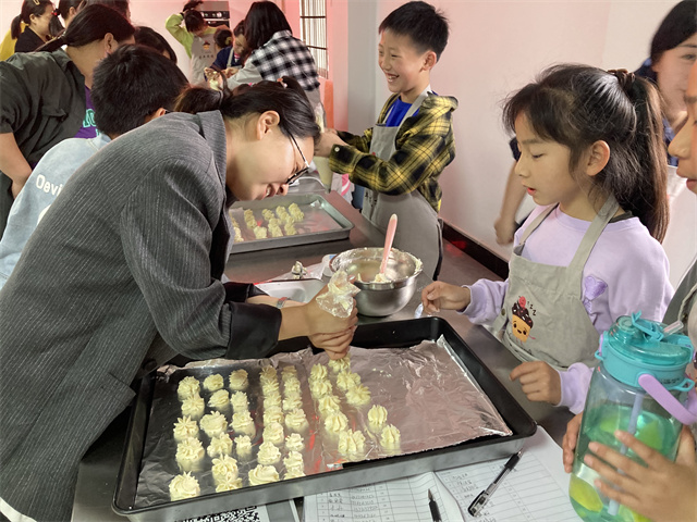 為了增進三眼井社區的居民親子關系,搭建孩子勞動技能鍛煉平臺,提供參與勞動的機會,學校聯合三眼井社區開展了本次親子烘焙活動。隨著家庭生活條件的改善,越來越多的孩子成為家中的“小公主”和“小王子”,過著豐衣足食的生活,很少有做家務的勞動體驗。制作曲奇餅干是孩子和家長都比較喜歡的項目,可以親自體驗曲奇餅干的誕生。從最初的打發黃油,到加入各種材料攪拌均勻,用裱花袋擠出花樣,送去烤箱,剛出爐的曲奇餅干香氣撲鼻,讓孩子們口水直流。