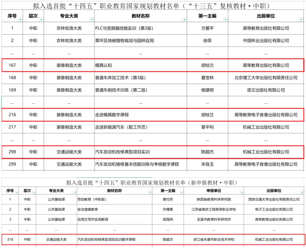 近日,教育部發(fā)布《關(guān)于擬入選首批“十四五”職業(yè)教育國家規(guī)劃教材名單的公示》。經(jīng)有關(guān)單位申報、形式審查、專項審核、網(wǎng)絡(luò)和會議評審、專家復(fù)核等程序,永康職技校有4本教材成功入選。包括胡桂蘭老師主編《模具認(rèn)知》《走進(jìn)模具數(shù)字課程》兩本教材,陳超杰老師主編《汽車發(fā)動機(jī)檢修典型實訓(xùn)項目》《汽車發(fā)動機(jī)檢修典型實訓(xùn)項目數(shù)字課程》兩本教材。