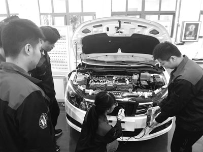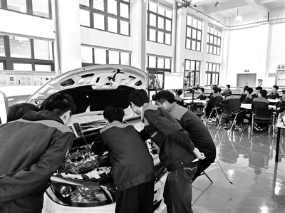 溫州職業(yè)技術(shù)學(xué)院瑞安學(xué)院新能源汽車專業(yè)教師在新能源汽車實(shí)訓(xùn)基地給學(xué)生講解電動(dòng)汽車的工作原理。陳先池 攝