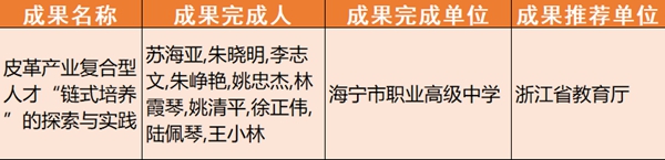 5月21日,教育部公示2022年職業教育國家級教學成果獎擬授獎成果的名單結束,海寧市職業高級中學成果《皮革產業復合型人才“鏈式培養”的探索與實踐》榮獲2022年職業教育國家級教學成果獎二等獎!也是學校第二次獲得國家級教學成果獎二等獎!