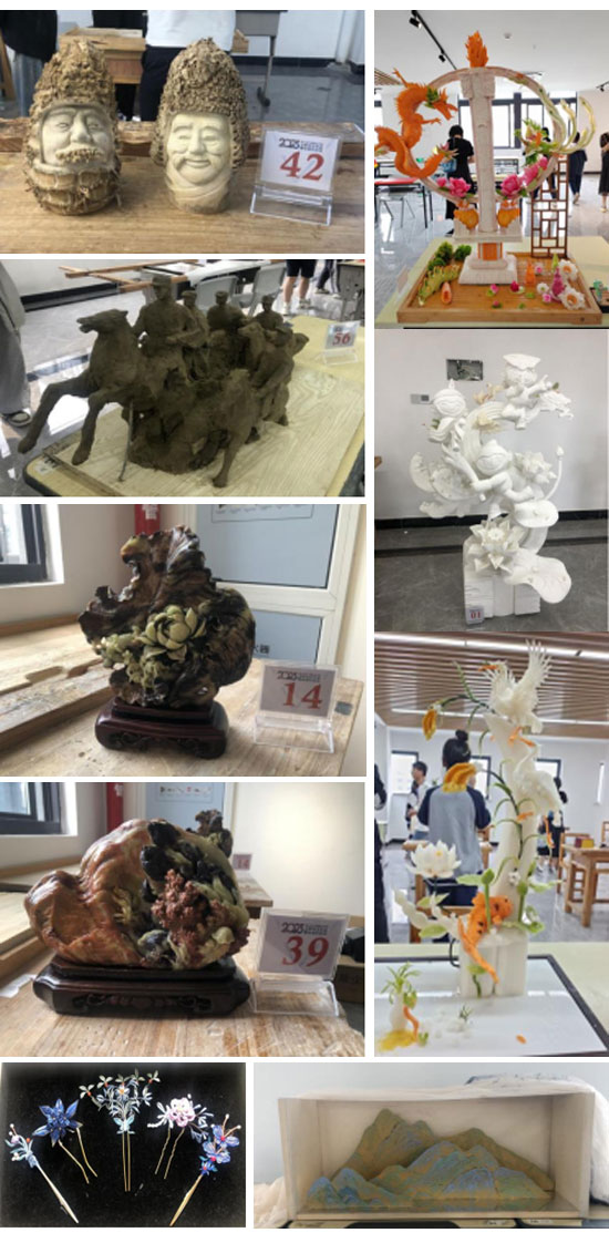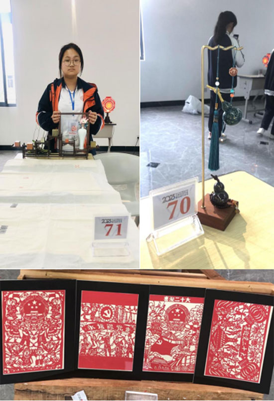 比賽過程耗時一天半,于5月27日12時30分結束,12時30分—14時30分,經過專家評審得出結果。14時30分—15時30分為交流參觀時間,選手和帶隊老師們,互相交流參觀,本校篆刻作品《為青春奮斗》、大漆作品《盛世逢春》、剪紙作品《同心喜迎二十大,千金非遺剪紙頌黨恩》系列,吸引了許多帶隊老師和學生駐足欣賞與拍照。