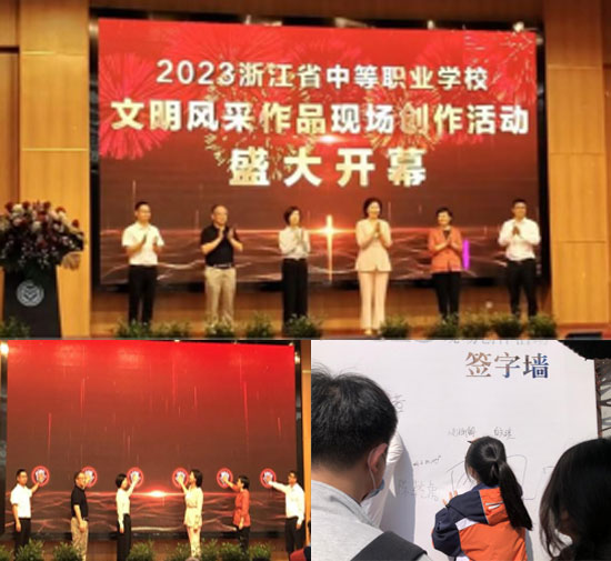 本次省文明風采大賽和以往不同,增加了非遺作品現場創作方向,并于2023年5月25日,在樂清市職業中專學校報告廳舉行了盛大的開幕式,省市相關領導出席了開幕式活動,浙江衛視、溫州、樂清等電視臺做了現場報道。