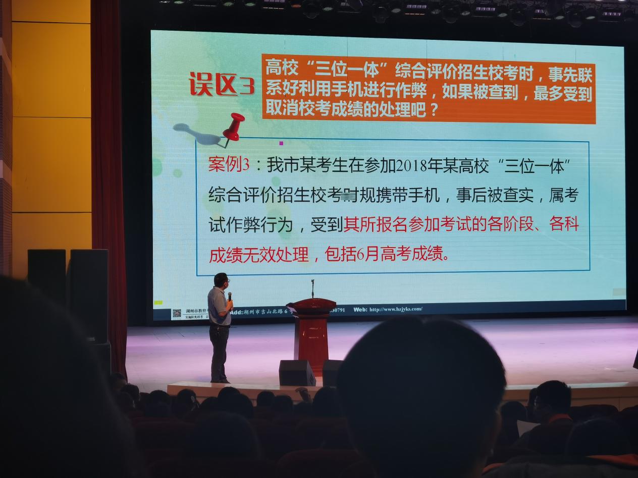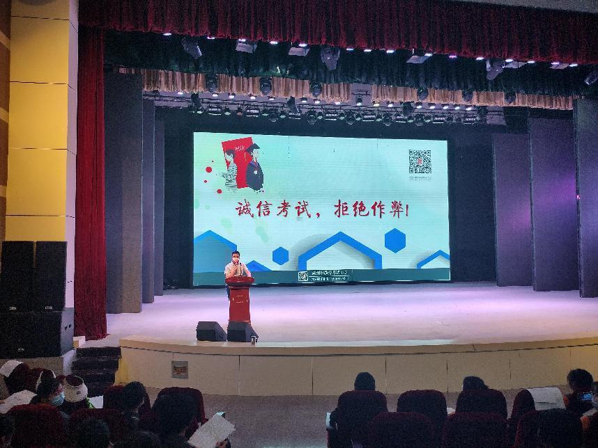 教務處朱小平老師從真實的誠信故事展開宣講,論述誠信對于個人成長的重要意義。他結合多年考務工作實際,突出介紹考試中經常出現失誤,進而可能影響誠信考試問題的案例,比如:帶入有存儲功能的電子設備、提前答題等。同時,他重點強調:今年突出的變化是手機等電子設備的二次安檢,辨析了違規、違紀等概念,再認知了這些行為可能會承擔的嚴重后果等。