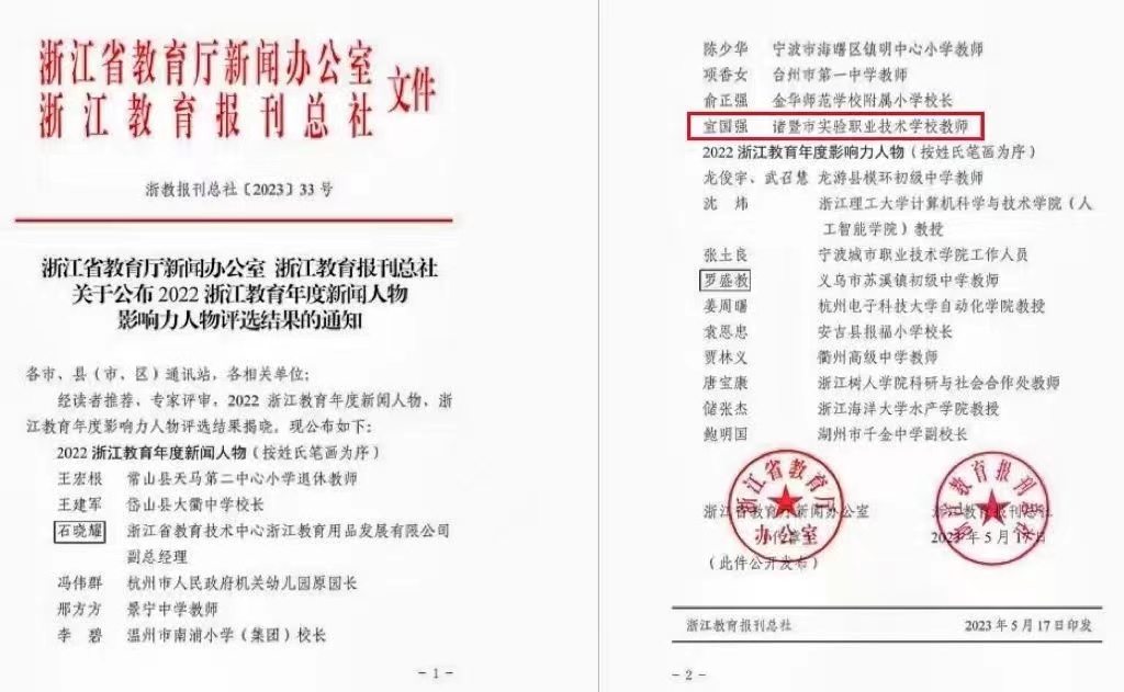 近日,浙江省教育廳新聞辦公室、浙江教育報刊總社公布2022浙江教育年度新聞人物和影響力人物共21名,諸暨市實驗職業技術學校(諸暨技師學院)教師宣國強成功上榜年度新聞人物,系紹興市唯一上榜人物。