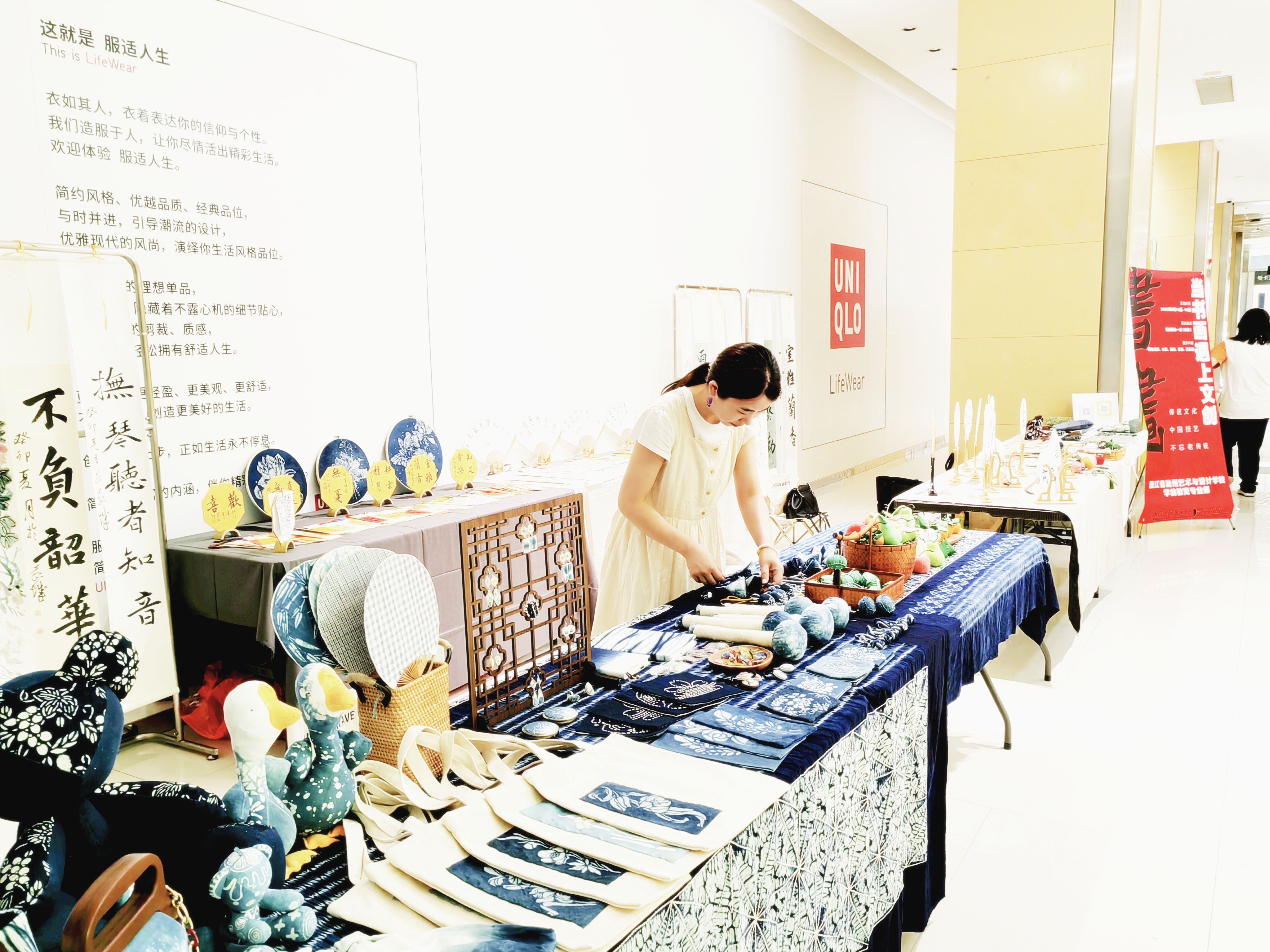 活動開始,銀泰百貨一樓仿佛變成一個絢麗多彩的藝術殿堂,彌漫著濃郁的藝術氛圍。展臺上擺放著各種各樣的傳統印染和中國書畫作品,讓人忍不住駐足觀賞。而在展示區旁邊,還設置了專門的DIY體驗區,讓市民帶著孩子們親身參與其中,在端午節到來之際感受香囊制作的魅力。