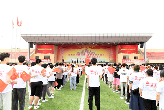 “沒有共產(chǎn)黨就沒有新中國……”大家揮舞著五星紅旗,齊唱《沒有共產(chǎn)黨就沒有新中國》,在歡快的歌聲中,拉開了畢業(yè)典禮的帷幕。