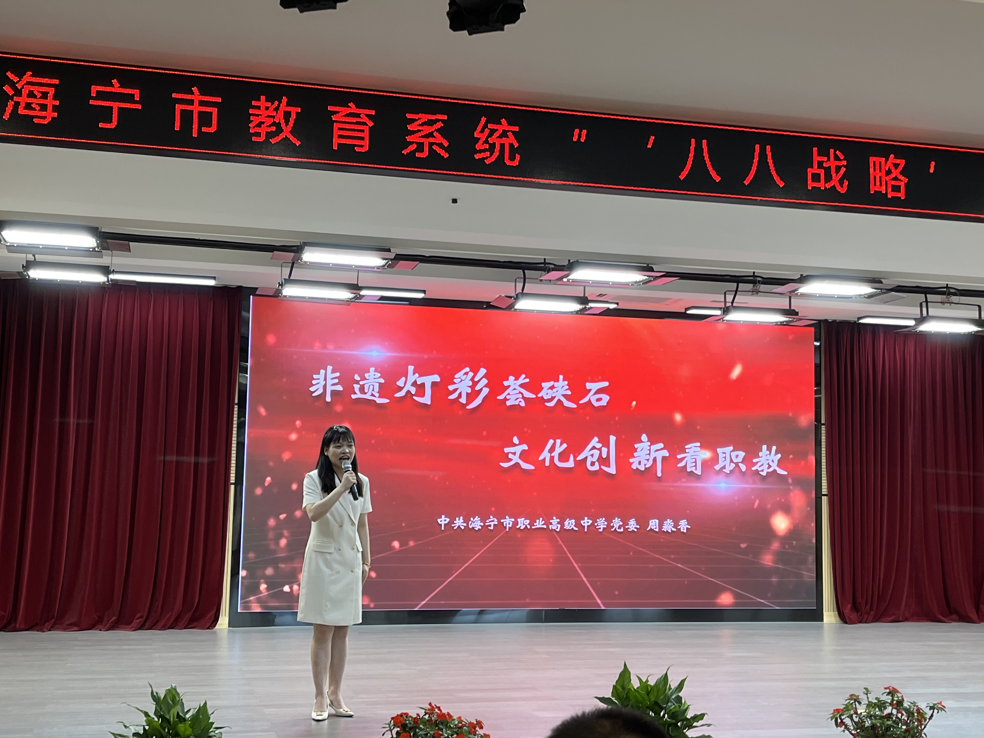 經過前期選拔,海寧職高《非遺燈彩薈硤石,文化創新看職教》入圍“八八戰略”在身邊微黨課決賽,青年黨員周淼香圍繞“八八戰略”在身邊,以傳統之薪,燃當代之火,從創新教育模式、創新文藝創作、創新傳播形式方面熱情宣講。(項笑利)