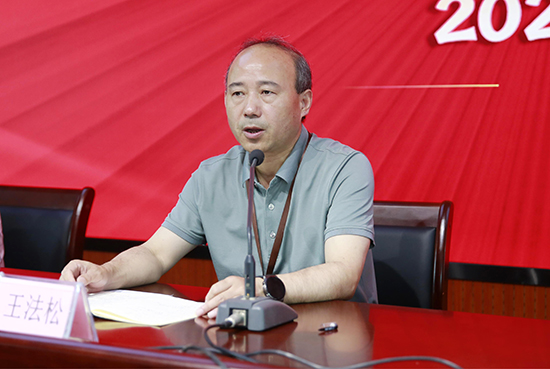 校黨委副書記、副校長(全面負責)王法松首先肯定了各部門和教職工在工作中取得的優異成績,對一學年來辛勤付出的教職工表示感謝。接著,王法松傳達了上級有關會議精神,并從治理能力現代化發展、學生素養穩步提升、隊伍建設成效顯著、社會服務提質增量、校企合作共生共贏、示范輻射功能增強等方面高度總結了這一學年的收獲,同時簡要介紹了2023學年工作計劃。