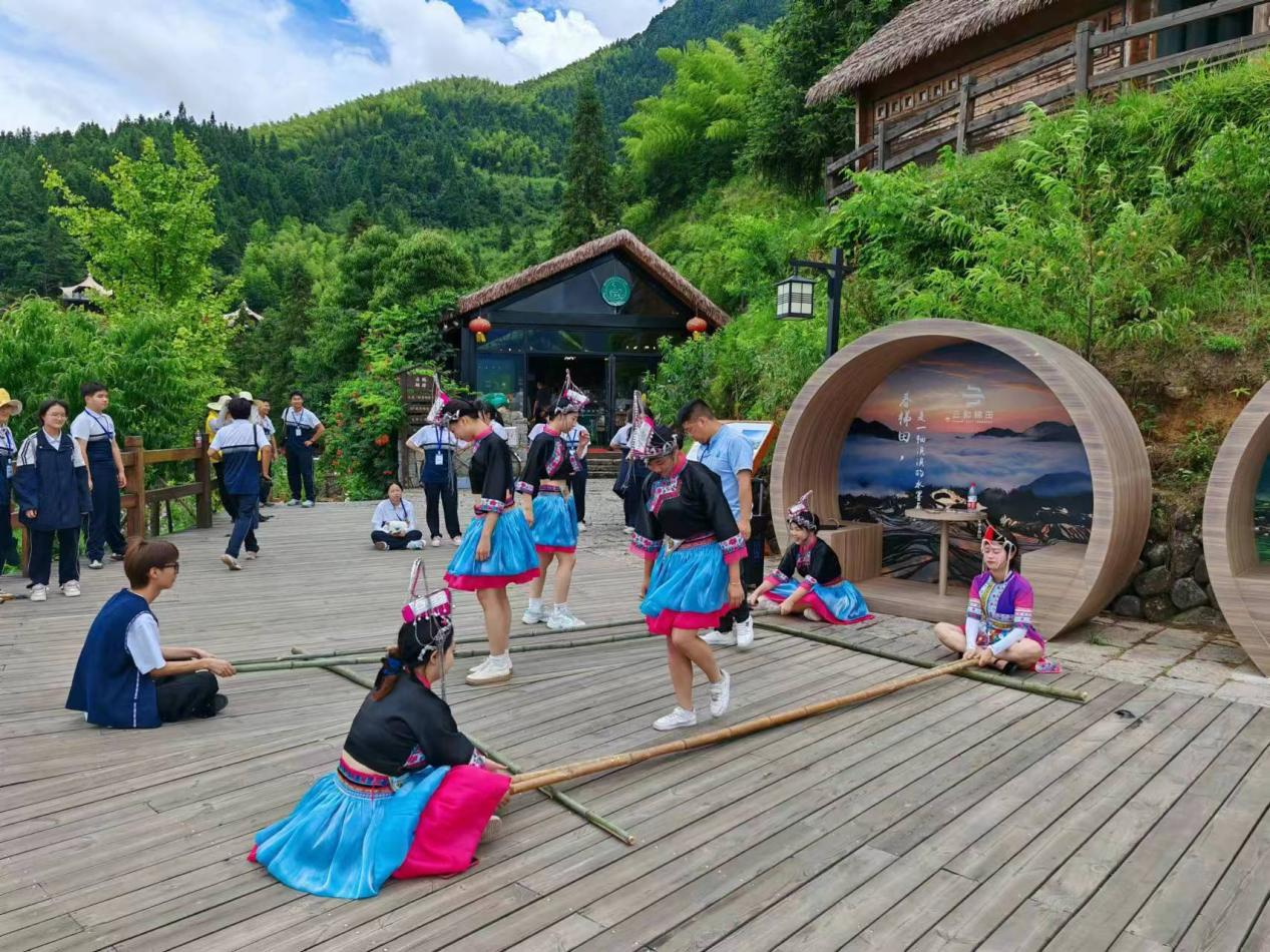 沿著山間石道,尋覓云和石寨坑根村;暢游九曲云環(huán),在這里,同學(xué)們體驗不一樣的畬鄉(xiāng)民俗活動——竹竿舞。 竹竿舞是畬族已有數(shù)百年歷史的古老祭祀方式,竹竿清脆的敲打聲配合著動感的音樂節(jié)奏,根據(jù)竹竿的擺動呈現(xiàn)的形狀分為“井字竿”“田字竿”等,在豐收的季節(jié),村民們跳上竹竿舞表達著喜悅之情。在身著民族服飾的畬族姑娘們的帶領(lǐng)下,同學(xué)們積極參與,伴隨“開、合、開、合、開開合”的節(jié)奏,在竹竿分合的瞬間,進退跳躍,順利穿越竹竿。