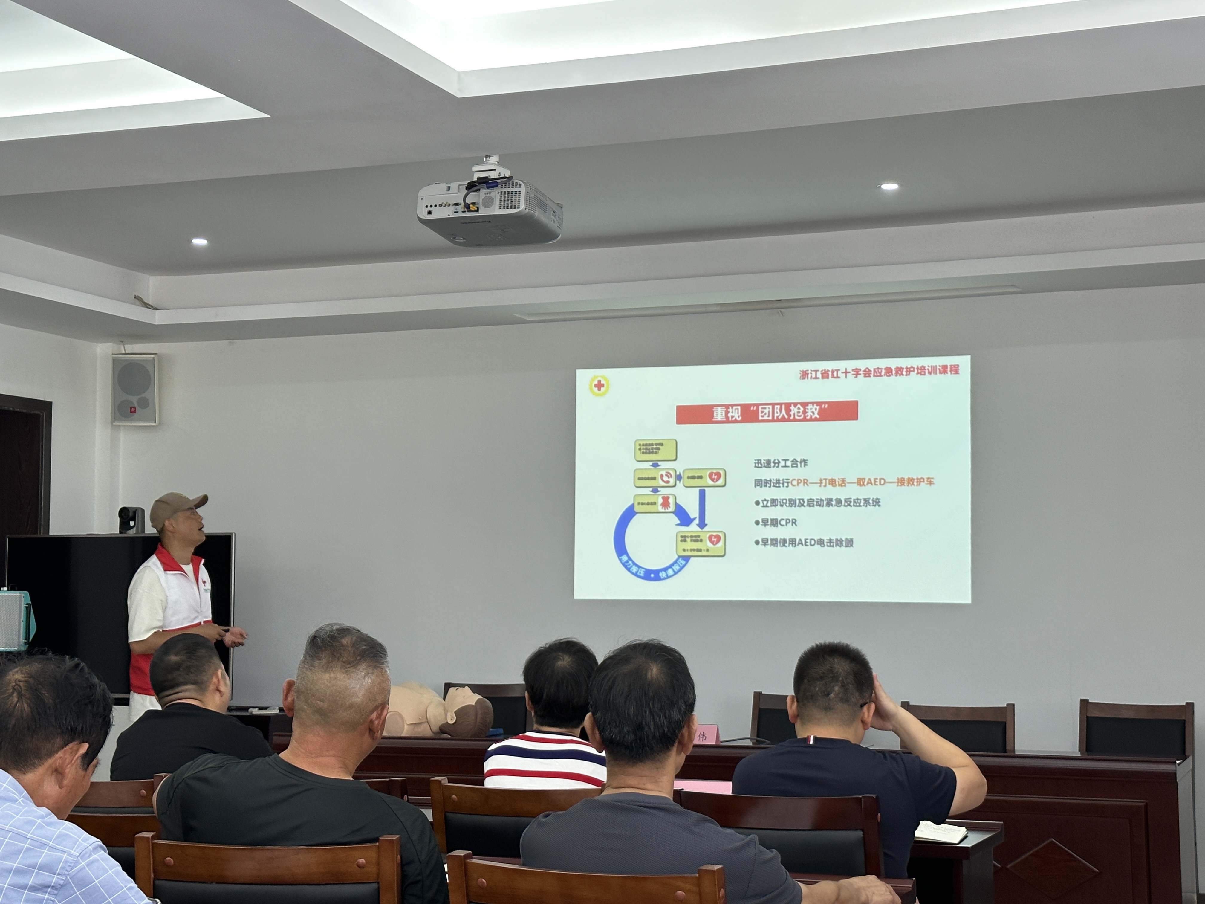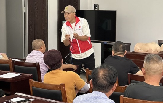 昌碩成校教師、浙江省紅十字會(huì)二級(jí)應(yīng)急救護(hù)師丁柏偉首先對(duì)中暑的癥狀與危害、高溫下如何防治中暑、保護(hù)自身安全進(jìn)行詳細(xì)的講解,并圍繞常用救護(hù)知識(shí)、救護(hù)原則、救護(hù)技巧和注意事項(xiàng)等相關(guān)知識(shí)進(jìn)行了急救知識(shí)普及,針對(duì)可能遇到的各種緊急情況,采取示范、互動(dòng)相結(jié)合的方式,進(jìn)行實(shí)際操作和互動(dòng)演練。現(xiàn)場還準(zhǔn)備了人體模型,讓參訓(xùn)人員掌握心肺復(fù)蘇、人工呼吸等常見的應(yīng)急救護(hù)技能。