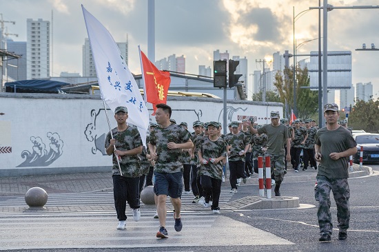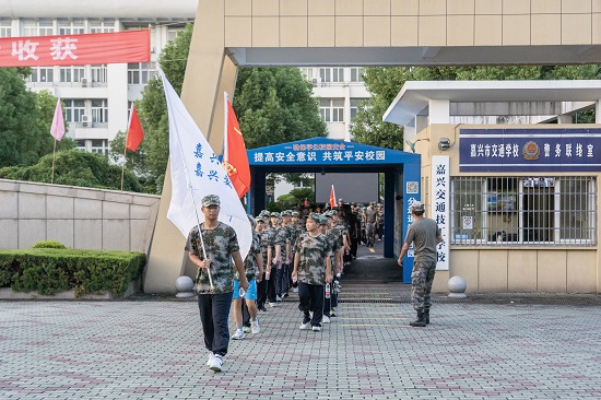 8月27日早上5時,晨光熹微,東方既白,當(dāng)大家還沉睡在夢鄉(xiāng)時,嘉興市交通學(xué)校的寢室樓前,新生各連隊已經(jīng)集結(jié)完畢,靜待命令。軍訓(xùn)項目之一——戶外拉練即將開始。副校長張雪明、許賢超,同樣身著迷彩服,與新生同行。