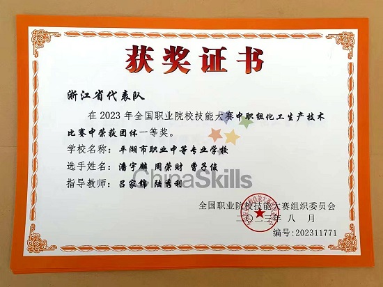 8月26日至30日,由國家教育部、國家發展改革委等多家單位主辦,全國石油和化工職業教育教學指導委員會等單位協辦的2023年全國職業院校技能大賽(中職組)化工生產技術賽項在淄博市工業學校舉行。平湖職業中專化學工程部原高三12班的周榮財、潘宇麟、原高二9班的曹子俊三位學生組成的浙江省代表隊,在呂家錦、陸秀利、沈張迪三位老師的精心指導下,齊心協力,奮勇進取,蟬聯全國技能大賽團體一等獎。