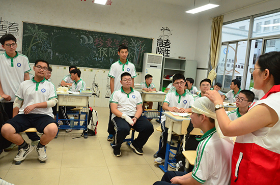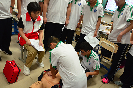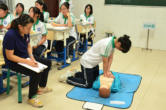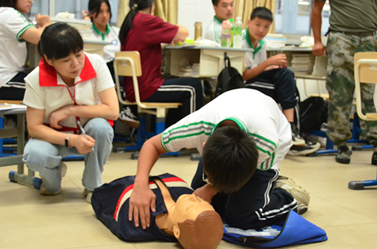 “喂,你怎么了?喂,你怎么了?”培訓(xùn)課上,培訓(xùn)老師親自示范,利用模型人對(duì)心肺復(fù)蘇、人工呼吸各項(xiàng)操作進(jìn)行示范演練,向同學(xué)們傳授常用的救護(hù)技能,同學(xué)們觀看得十分仔細(xì)。待老師示范完畢后,同學(xué)們紛紛上臺(tái)實(shí)踐操作,培訓(xùn)老師對(duì)他們的動(dòng)作進(jìn)行一一指正。