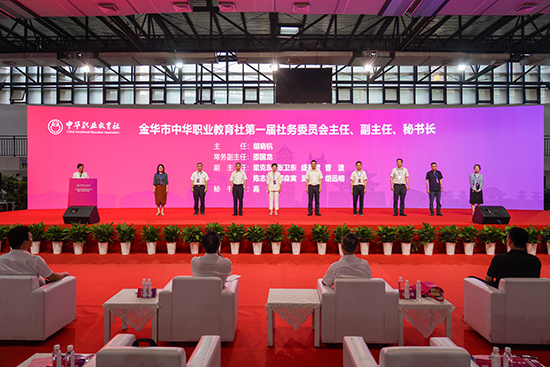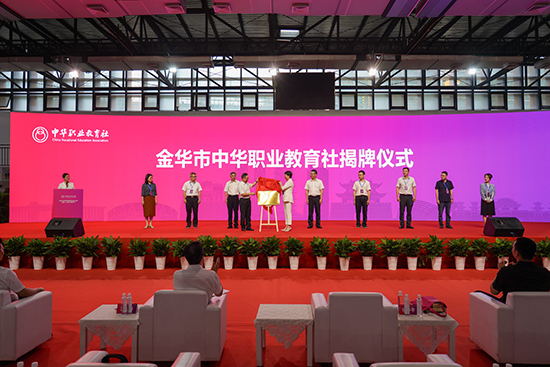 在全場(chǎng)熱烈的掌聲中,陳小平和胡曉杭共同為金華市中華職業(yè)教育社揭牌。