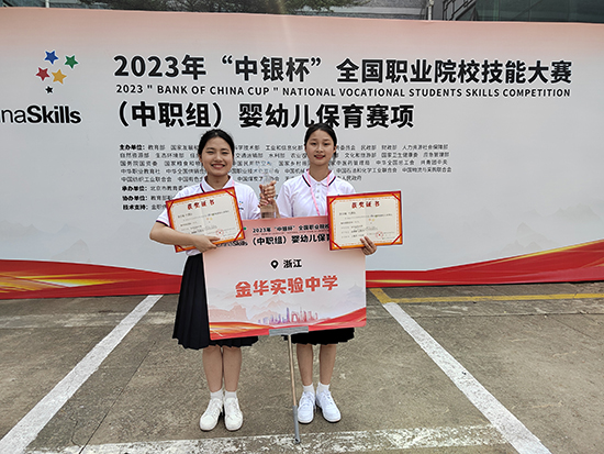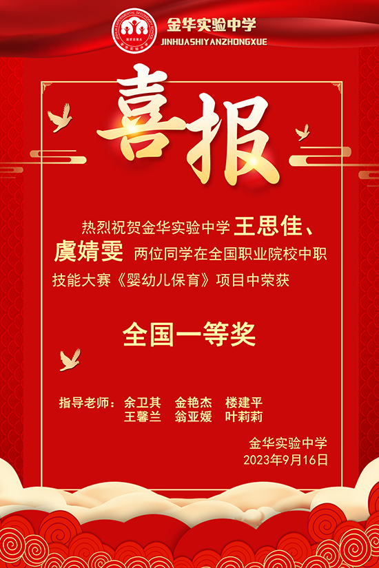 9月13日至16日,由教育部主辦的全國(guó)職業(yè)院校技能大賽中職學(xué)前教育(嬰幼兒保育)項(xiàng)目比賽在北京舉行,金華實(shí)驗(yàn)中學(xué)學(xué)前專(zhuān)業(yè)王思佳、虞婧雯兩位同學(xué)代表浙江省出征國(guó)賽,憑借扎實(shí)的功底、嫻熟的技能和出色的表現(xiàn),從全國(guó)168位選手中脫穎而出,榮獲全國(guó)一等獎(jiǎng)!
