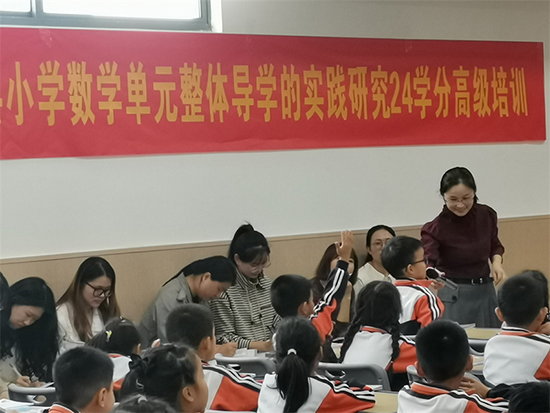 學(xué)員們參與了省規(guī)劃課題《小學(xué)數(shù)學(xué)以大觀念統(tǒng)攝領(lǐng)域整體教學(xué)的實(shí)踐與研究》實(shí)踐研討活動(dòng),特邀湖州市小學(xué)數(shù)學(xué)教研員楊海榮老師、長興縣小學(xué)數(shù)學(xué)教研員楊明嵐老師全程參與指導(dǎo)。參訓(xùn)教師代表盧穎、吳申仙、何彥菁、柏敏霞、俞雪鈺等二十人全程參與課題組的模擬上課、改課、重構(gòu)等活動(dòng),其他參訓(xùn)教師觀摩整個(gè)過程。通過這種卷入式實(shí)踐,幫助參訓(xùn)教師樹立統(tǒng)整的數(shù)學(xué)教學(xué)意識,并引導(dǎo)他們基于“圖形與幾何”大單元整體進(jìn)行教學(xué)設(shè)計(jì)、實(shí)施與反思等一系列的教學(xué)組織活動(dòng)。