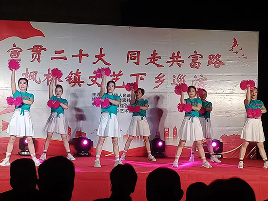 歡快的樂曲聲響起,諸暨市楓橋鎮(zhèn)楓之韻藝術團表演的舞蹈《盛世歡歌》濃裝上臺,明快的舞步、動感的音樂立馬吸引住了村民,紛紛拿起手機拍照。當楓橋老年人太極氣功隊上臺表演時,全場響起了掌聲,老人們英姿颯爽,對襟的黃褂、悠閑的神情、淡定的氣勢,合著音樂的旋律,神清氣閑展示太極的一招一式,手中的養(yǎng)生杖揮灑自如,讓臺下觀眾一飽眼福。“香啊!香?。∮组缄囮嚦鲩缄帲缄幧缴戏奸寂鸨樯搅?,香榧十里照春水,越中遍是育榧人”悠揚的越歌破空而來,由楓橋鎮(zhèn)楓之韻藝術團謝月美演唱,團長駱幼群編排的《越歌伴舞:香榧吟》隆重登場,掀起了演出的高潮,優(yōu)美的唱腔、婀娜的舞姿、流暢的動作無不給人以美的享受,鄉(xiāng)音鄉(xiāng)調讓人勾起對家鄉(xiāng)的無限熱愛之情。旗袍秀、爵士舞、越劇、柔力球依序輪番表演,觀眾們紛紛喝彩叫好。最后,全體演出人員齊唱《我和我的祖國》。