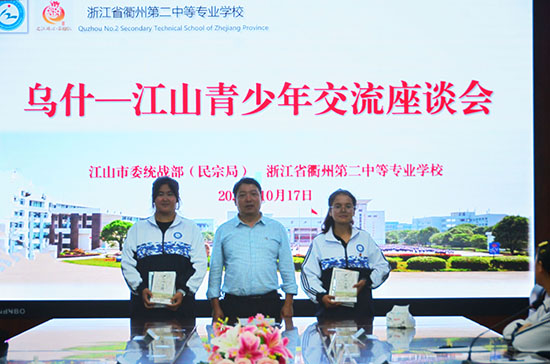 10月17日下午,江山市委統(tǒng)戰(zhàn)部副部長、民宗局局長王向明一行來到衢州第二中等專業(yè)學(xué)校看望來自烏什縣職業(yè)技術(shù)學(xué)校的三名師生,并舉行烏什——江山青少年交流座談會。