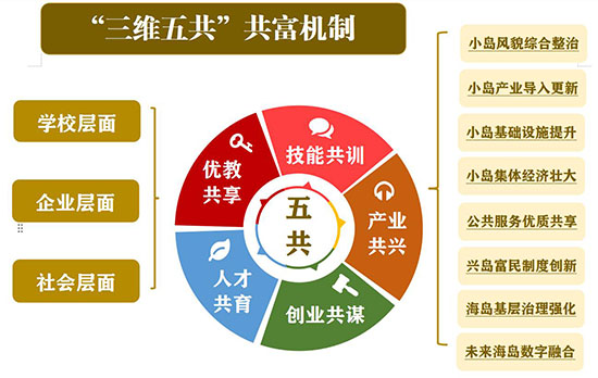 學校根據舟山市在海島區縣實施“海島共富”八大工程的整體要求,與海島區縣政府合作,從“學校、企業、社會”三個維度出發,構建優教共享、技能共訓、產業共興、人才共育、創業共謀的“三維五共”職教共富機制,精準供給、助力工程。