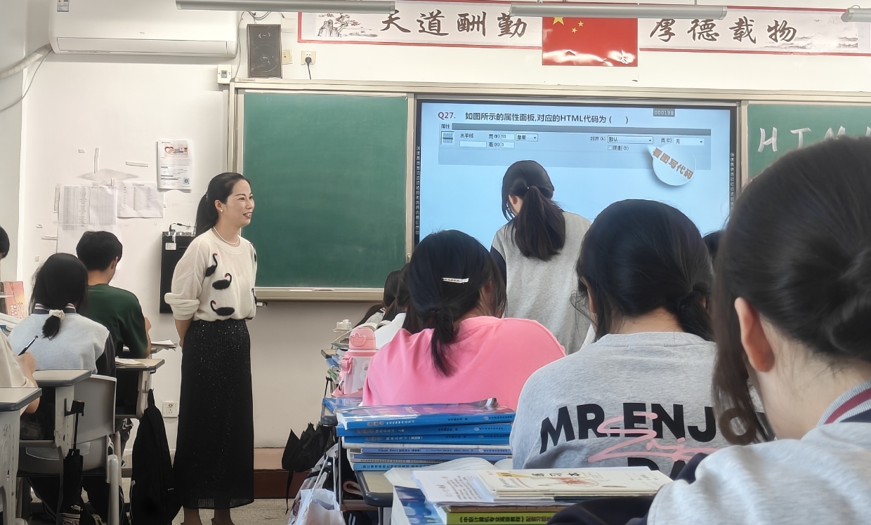 第三節課由鄭建美老師開的《HTML語言專題復習》。鄭老師通過讓學生完成答題,了解了他們對知識的掌握情況,并收集了他們的典型錯題。在課堂上,她利用小游戲調動學生的積極性,讓他們參與到復習中。她帶領學生復習了HTML的標記、屬性和書寫格式,利用生動的實例使學生更好地理解和記憶。