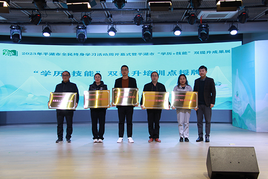 對(duì)浙江開放大學(xué)平湖學(xué)院、衛(wèi)星能源公司、鐘埭成校、松楓社區(qū)、鄉(xiāng)村振興產(chǎn)業(yè)學(xué)院“學(xué)歷+技能”雙提升培訓(xùn)點(diǎn)進(jìn)行授牌。
