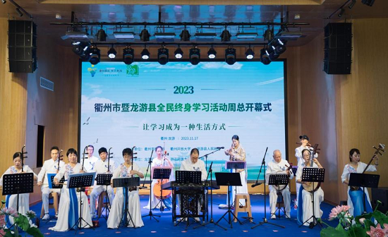 本次開幕式活動形式多樣、豐富多彩,充滿地方元素特色。有龍游縣社區(qū)學院選送的民樂合奏《撥根蘆柴花》、柳園小學的婺劇《別洞觀景》、模環(huán)鄉(xiāng)社區(qū)學校的道情說唱《家鄉(xiāng)的變化》、實驗幼兒園的情景劇《永不消逝的電波》以及詹家鎮(zhèn)社區(qū)學校的畬族舞蹈《山哈一曲唱浦山》等文藝節(jié)目,來自龍游縣15個鄉(xiāng)鎮(zhèn)(街道)社區(qū)學校分管負責人共同宣讀了《全民終身學習活動倡議書》。