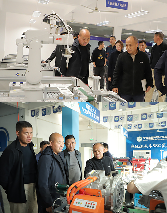 在鄞州職高副校長馮朋員的陪同下,考察團一行參觀了智能制造實訓室、汽車智慧實訓室、汽車機電維修實訓室、工業機器人實訓室等各實訓場地。徐湖川校長感嘆,學校沒有停下發展的腳步,專業設置不斷優化,專業設備與時俱進,有了許多新變化。