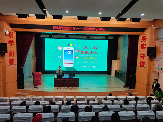 11月20日下午,安吉社區教育學院報福學習中心在報福村文化禮堂舉行老年人智能手機培訓,本次培訓邀請安吉技師學院季艷茹老師主講,報福村50余名老年人參加培訓。