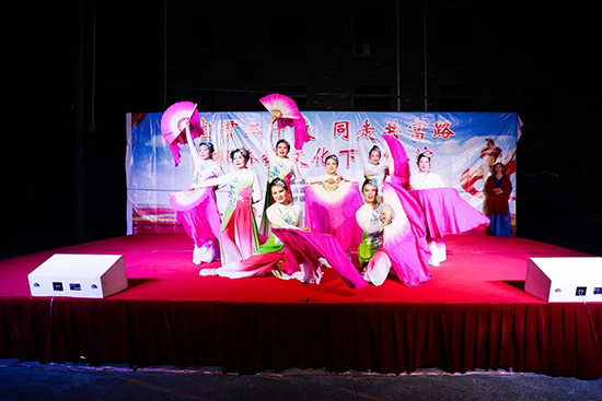 “總想對你表白,我的心情是多么豪邁……”當歌聲傳來,楓橋開心姐妹舞蹈隊表演的扇子舞《走進新時代》來到臺上,身著金黃帶紫花的落地裙裝、手持紅黃綠相間的舞蹈扇,隨著音樂的起伏,表情豐富地在臺上展示一個個優美的造型,沉醉于音樂的節拍中,奔跑、轉換、分合是那樣靈動、那樣自然,忽似一朵朵鮮花怒放、又似一道道波浪起伏,無不給人以美的享受,人群中的“咔嚓”聲此起彼伏。全體演員向觀眾謝幕,并合唱《我和我的祖國》。