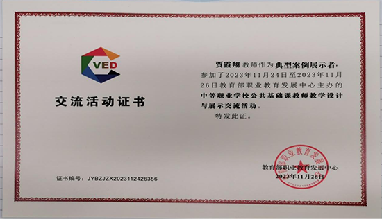11月26日,2023年全國中等職業(yè)學(xué)校公共基礎(chǔ)課教師教學(xué)設(shè)計與展示交流活動在南京落下帷幕,溫州市龍灣區(qū)職業(yè)技術(shù)學(xué)校賈霞翔老師表現(xiàn)優(yōu)異,獲得評委一致好評,其參賽作品入選全國中等職業(yè)學(xué)校公共基礎(chǔ)課教師教學(xué)設(shè)計典型示范案例,將由高教社出版,全國推廣。