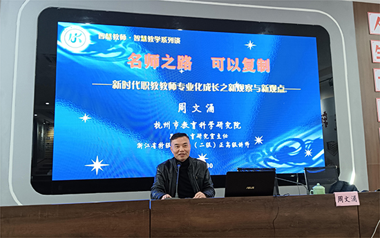 周文涌教授給學員們作了題為《名師之路 可以復制》的專題講座。他從自身的成長經歷說起,講述了專業教師成長各階段的規律、發展目標。重點講授了一名優秀教師的標準、特征和一堂好課的評價標準。周文涌教授的現身說法和大量生動的案例闡述,猶如一盞明燈點亮了學員們的職業生涯路。