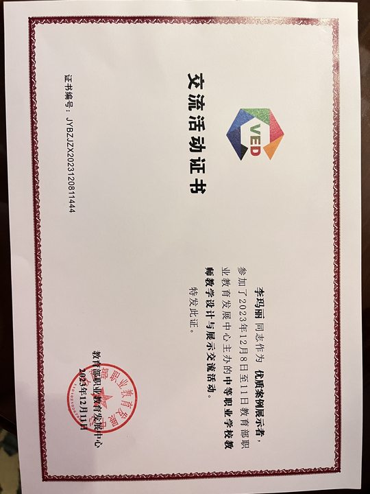本次活動由教育部職業教育發展中心主辦,高等教育出版社承辦,全國千余名參賽教師匯聚一堂,同臺競技。活動內容主要包括專家講座和教師教學能力展示交流。參加活動的選手,分說課12分鐘和答辯3分鐘兩個環節進行交流展示。經過選拔,學校教師李瑪麗的參賽作品被評為“優質案例”,并將收錄入國家職業教育智慧教育平臺。