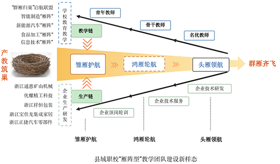 2021年以來,學校不斷聚焦地方產業特色,深化師資隊伍建設,產教融合打造學校重點特色專業“雁陣型”創新團隊建設。學校以機械專業高水平建設為契機,發揮專業建設的示范引領作用,構建基于思維轉型的產教融合新模式,深化機械、電子電工、烹飪專業的校企融合師資隊伍培養。聚焦縣域“以發展現代制造業為主,以優化出口結構為主,致力于發展高新技術產業”整體布局,優化發展專業方向,打造支撐縣域經濟發展與產業轉型的“產教之巢”。一是析標準:構筑“產教之巢”,以“課堂、課改與課題”為突破口,聯盟共同厘定“教學實施力、研究實踐力、研發實戰力”教師培養標準,服務全周期成長孵化。二是優路徑:“頭雁領航、鴻雁輪航、雛雁護航”三進階教師培養,創新企業專家駐校實現“歸雁伴航”,企校雙棲,形成雁陣型師資航行。三是創機制:企校雙域耦合、混合雙線融合與產教雙維嵌合,形成“融合共育·融通成長·融貫評價”三大機制。聯合17名省內名師、5名教研導師與8名行業大師,一體化構筑起“群雁歸巢”教師啟航聯盟,深化教師創新團隊建設,栽得梧桐,引來鳳凰,筑巢生長。
