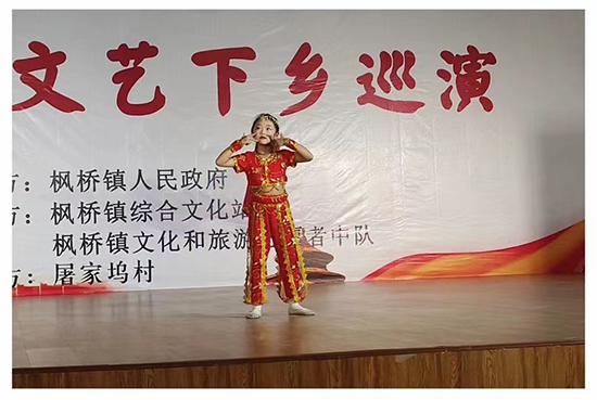 楓橋鎮楓之韻藝術團的開場舞《盛世歡歌》通過艷麗的服裝、統一的動作、灑脫的舞姿,吸引了臺下觀眾的目光。接著,隨著異域風情的音樂響起,一個身穿色彩鮮艷舞服的小女孩合著音樂節拍跳起印度舞《歡樂的婆羅多》,她叫屠果姸,今年8歲,奔放的動作、妸娜的身姿、動人的笑容征服了觀眾的心,大家不由贊嘆“跳得真好!”當《佳木斯快樂舞步》的演員上臺后,現場響起熱烈的掌聲,屠家塢村舞蹈隊的隊員們身著紅白相間的運動裝,手戴白色手套,12個人隨著音樂的節奏舞動,動作熟練、姿態自然,陶醉在舞蹈帶來的快樂中。到季麗君、屠朝琴的越劇唱段《孔雀東南飛選段》《洞房》時,現場氣氛熱烈,精準的唱腔、清晰的吐詞、嫻熟的動作,盡管素妝上臺,同樣獲得了觀眾的好評。觀眾們沉浸在一個個精彩的節目中,現場掌聲不斷。