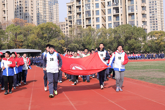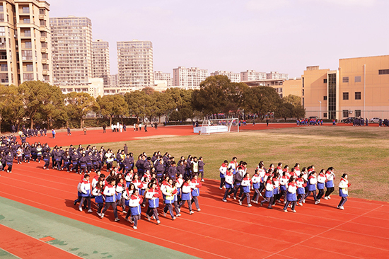 頂著寒風,四名校田徑隊員守護著校旗,步調一致地跑在跑道中央,全校79個班級組成的79個方陣由班主任帶隊一起慢跑前進,體育分管校長則領跑在前。因為班級數量較多,全校各班分成田徑場、籃球場、行政樓大花壇周邊三個區域同時展開跑步,跑步的距離是1200米。幾圈跑下來,同學們感到渾身暖和,倍感舒適,個別同學雖然氣喘吁吁、累得幾度想放棄,但還是在老師的鼓勵下堅持跑完全程。