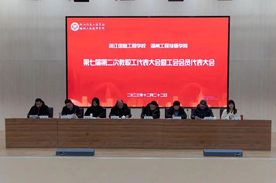 12月22日下午,浙江信息工程學校·湖州工程技師學院第七屆第二次教職工代表大會暨工會會員代表大會在高端裝備制造實訓基地報告廳隆重召開。校黨委書記、校長崔燕榮,副書記、副校長張建霞,黨委委員、副校長姚志恩、褚劍飛、朱曉慧、湯方榮、陸婷及教代會主席團成員出席大會,會議由工會主席余佳駿主持。