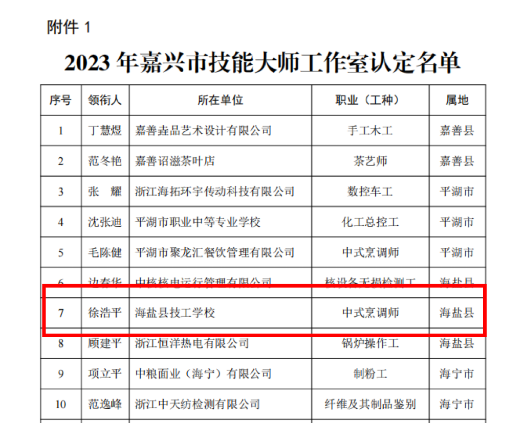 日前,海鹽縣理工學校徐浩平技能大師工作室被認定為2023年嘉興市技能大師工作室,這是該校繼胡立標技能大師工作室、儲利華技能大師工作室之后創建的第三個市級技能大師工作室。這也充分體現了上級主管部門對該校專業技能教學團隊建設的高度認可。