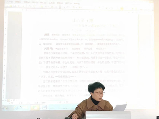 活動(dòng)開(kāi)始,葉丹萍組長(zhǎng)就此次講座做了簡(jiǎn)單介紹。緊接著,吳子?jì)偫蠋煆娜齻€(gè)方面進(jìn)行了深入解讀。每一個(gè)環(huán)節(jié)吳老師都以自己的歷史教學(xué)案例做詳細(xì)分析。首先,她以《商鞅變法與秦的強(qiáng)盛》為例講解了“創(chuàng)設(shè)情境——提供學(xué)生自主學(xué)習(xí)的空間”。強(qiáng)調(diào)了:教師是課堂教學(xué)活動(dòng)的策劃者、組織者和指導(dǎo)者,如果教師能夠抓住教材中所蘊(yùn)涵的創(chuàng)造性因素,激起學(xué)生學(xué)習(xí)情感,創(chuàng)設(shè)問(wèn)題情境,引導(dǎo)學(xué)生去發(fā)現(xiàn)、去探究,那么學(xué)生自主學(xué)習(xí)的欲望就會(huì)孕育而生。其次,以《中國(guó)民族資本主義的發(fā)展歷程》解讀了“如何展示過(guò)程來(lái)激發(fā)學(xué)生自主學(xué)習(xí)的情趣”。最后,就“體驗(yàn)成功——增強(qiáng)學(xué)生自主學(xué)習(xí)的信心”做了介紹。吳老師的講解體現(xiàn)出了她對(duì)當(dāng)下學(xué)生自主學(xué)習(xí)的認(rèn)真研究和對(duì)學(xué)生的真切關(guān)懷。